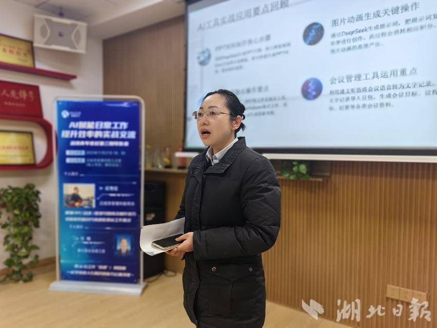 侯畅讲师重点围绕“人工智能与工作效率”、“PPT素材制作”和“图像动画生成”三个模块,通过现场演示展示了AI工具快速生成PPT框架、优化布局设计、创作创意图画和动画的全过程,直观地展示了AI如何变得更简单。物质工作“质量和速度都有所提高”;实习员工杨伦说:“以前做一个PPT需要半天时间,现在利用AI工具20分钟就可以完成,而且还可以自动生成动画效果,效率的提升是显而易见的!”现场互动频繁,学习氛围浓厚。