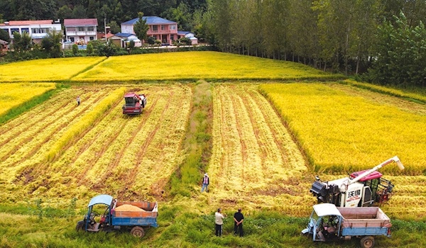 在黄金秋季期间,Sui县Liulin Town的Jiangjuntai村的数千公顷的稻田是金色的,是金色的耳朵。三人全速收获了驾驶员,将驾驶员倒退到场地上,咆哮听起来很开心。空气充满了新鲜的米饭,村民的脸上露出了灿烂的笑容。这是碰碰收获的又一年!