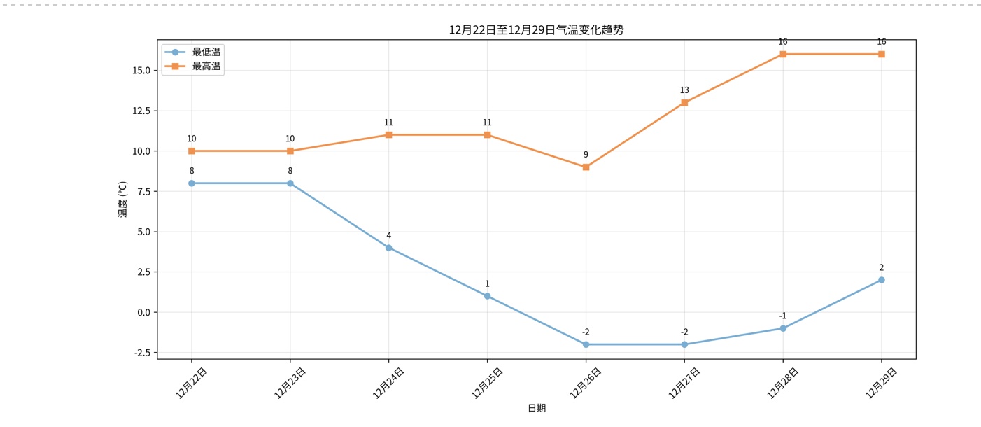 湖北日报讯(记者唐薇薇通讯员高启庆)12月22日上午,武汉市多云,全市大部分地区最低气温6至8℃。 22日至24日,武汉有小雨。外出的朋友一定要带好雨具。此外,受弱冷空气影响,23日至25日,武汉偏北风将加强。 26日至28日低温将降至0度以下。武汉市气象局提醒大家注意保暖,避免受凉。 12月22日近期天气预报:多云有小雨,东风至北风2至3级,气温8-10℃; 12月23日:多云有小雨,北风3级,阵风4~5级,气温8~10℃; 12月24日:阴天,零星小雨,北风3~5级,气温4~11℃; 12月25日,多云,北风3~4级,转东风2~3级,气温1~11℃; 12 月 26 日:阴转晴,东风2~3级,气温-2~9℃; 12月27日:晴转多云,东风2~3级,气温-2~13℃; 12月28日:晴转多云,东风2级至3级,气温-1~16℃; 12月29日,多云到多云,偏北风2级到3级,气温2~16℃。